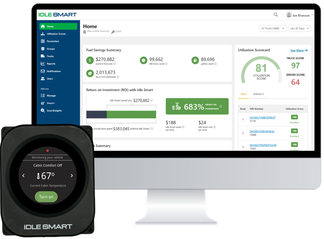 Idle Smart gives you instant, fleet-wide control over engine idling, while keeping cabin temperatures comfortable and protecting against no-starts. The system works seamlessly across OEMs, relaying critical data to our SmartPortal software, where you can adjust 30+ parameters for your fleet without a single trip to the shop. Idle Smart is a powerful combination of automation and control, delivering more savings for less hassle.