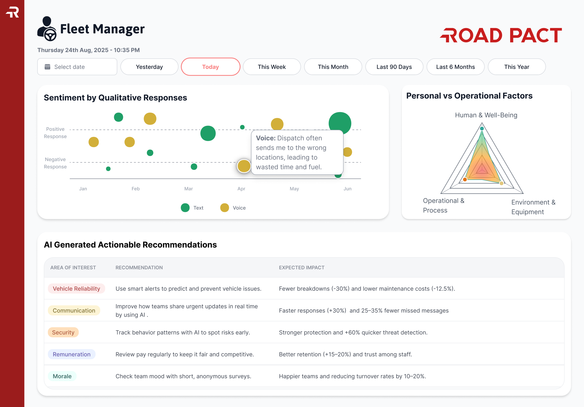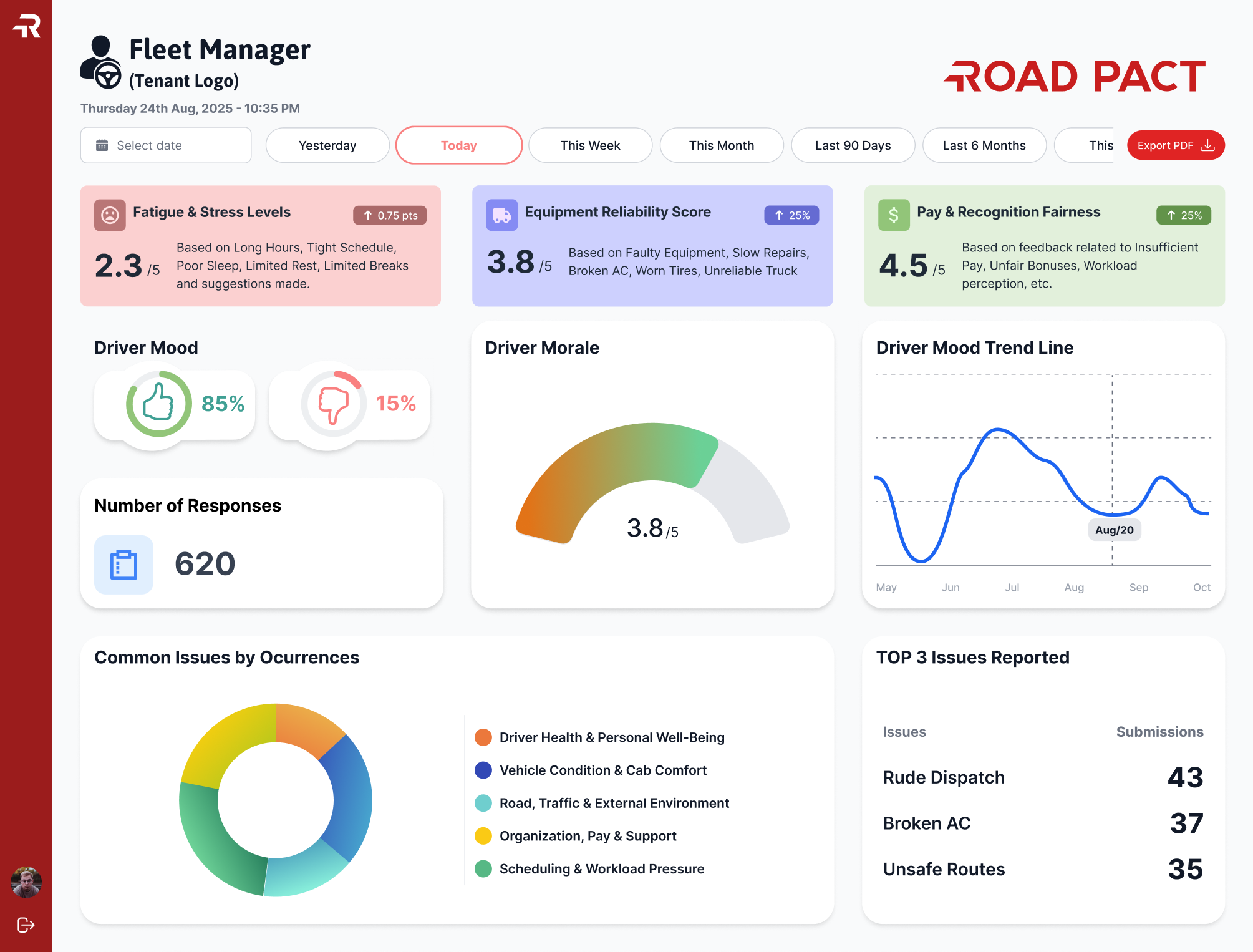 Driver turnover is one of the most costly challenges in the industry, and fleets often lack real visibility into how drivers feel day to day. Road Pact makes it easy to capture real-time driver feedback, identify emerging issues, and take action before a driver decides to leave. With simple daily check-ins and powerful insights, fleets can strengthen relationships, improve satisfaction, and build a more stable, loyal driver workforce.